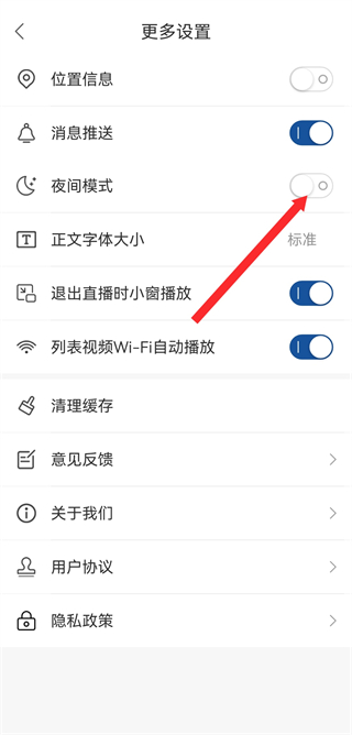 3、在頁面中找到夜間模式選項(xiàng),將其開關(guān)開啟,即可完成設(shè)置。