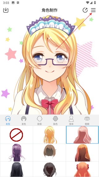 1、在角色制作界面,點擊右上角的三條橫線菜單按鈕。