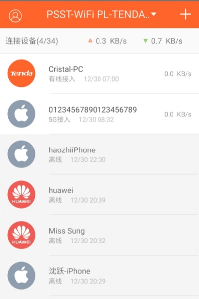c、通過騰達(dá)wifiApp查看當(dāng)前在線主機(jī)及其上行/下行速度,添加黑名單和限制主機(jī)網(wǎng)速。