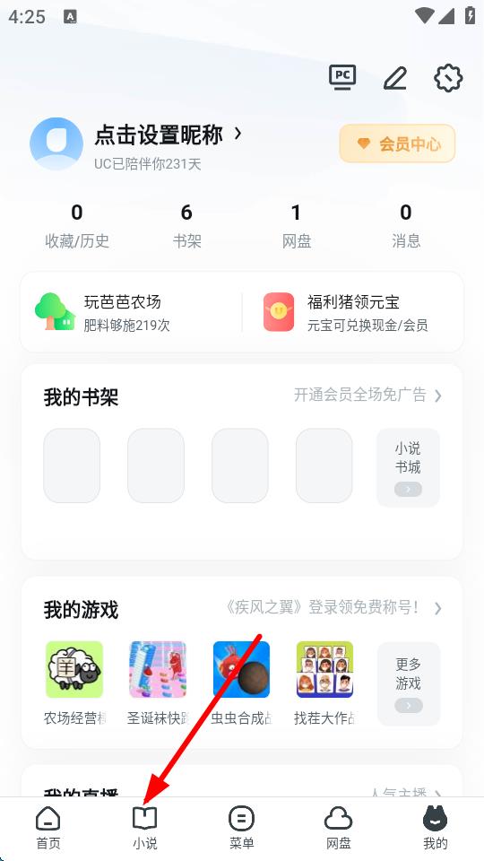1、打開UC瀏覽器,點(diǎn)擊底部導(dǎo)航欄中的小說選項(xiàng),進(jìn)入小說界面。