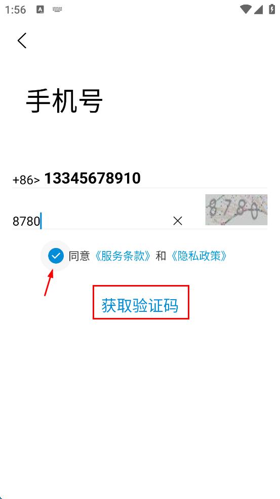 4、勾選同意服務條款和隱私政策,然后點擊“獲取驗證碼”,等待后續(xù)操作。