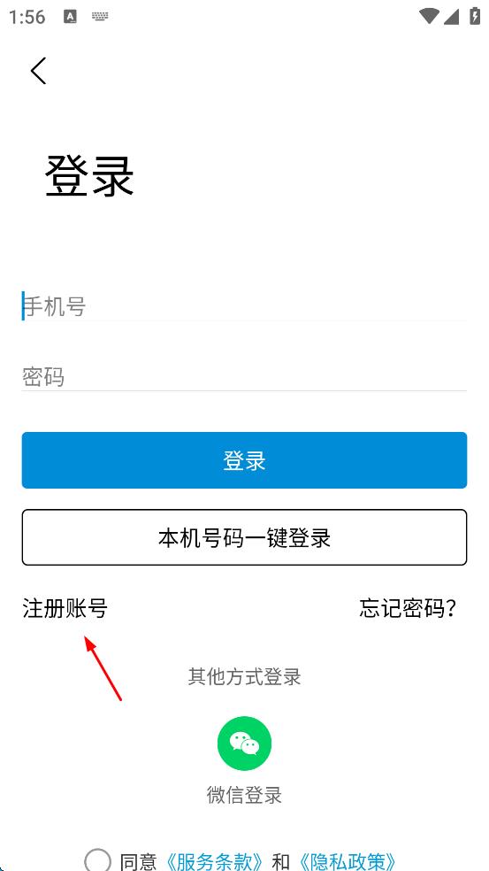 2、在密碼登錄頁面,點擊“注冊賬號”選項。