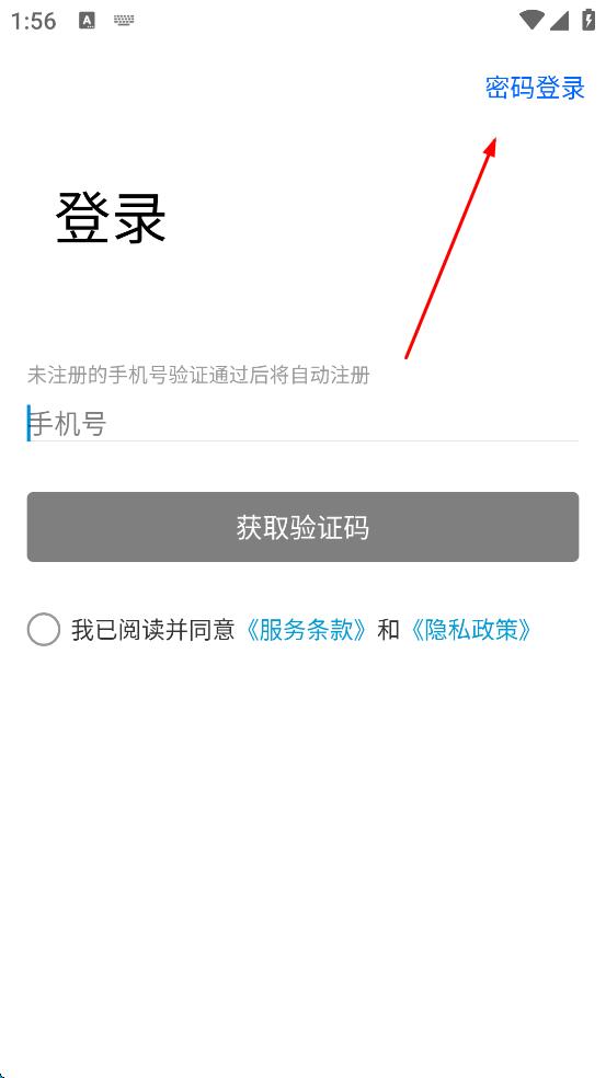 1、打開APP,進入登錄頁面后,點擊頁面右上角“密碼登錄”選項。
