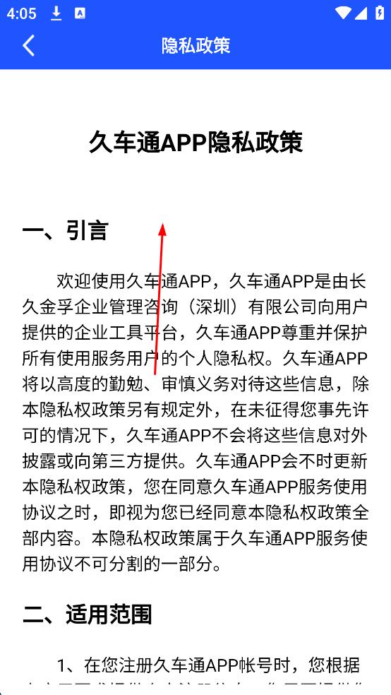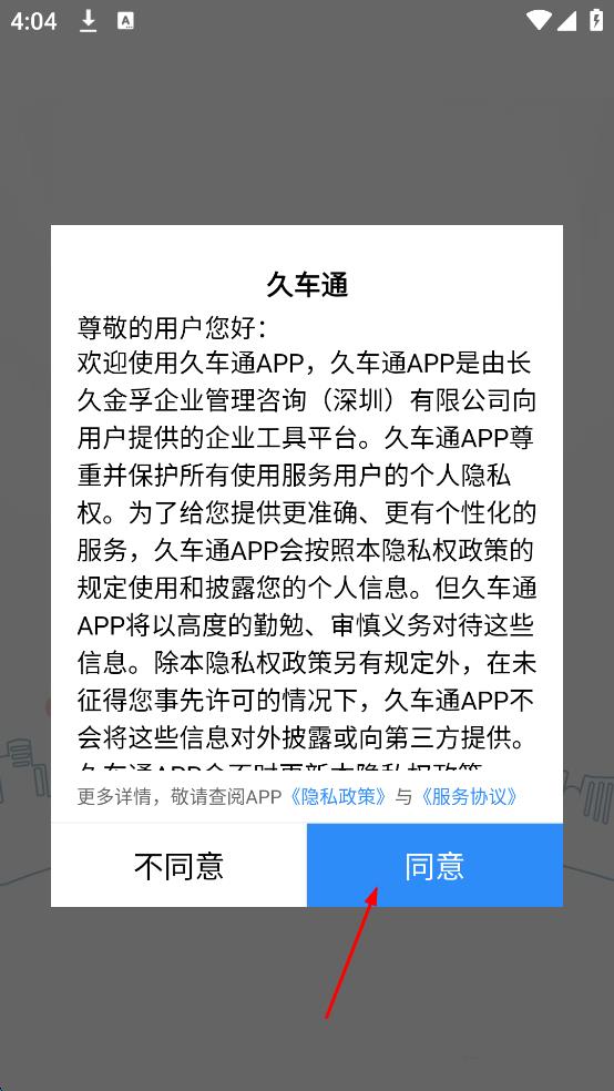 1、打開久車通APP,彈出隱私政策說明彈窗,閱讀內容后點擊“同意”,進入隱私政策詳情頁可再次查看規(guī)則 。