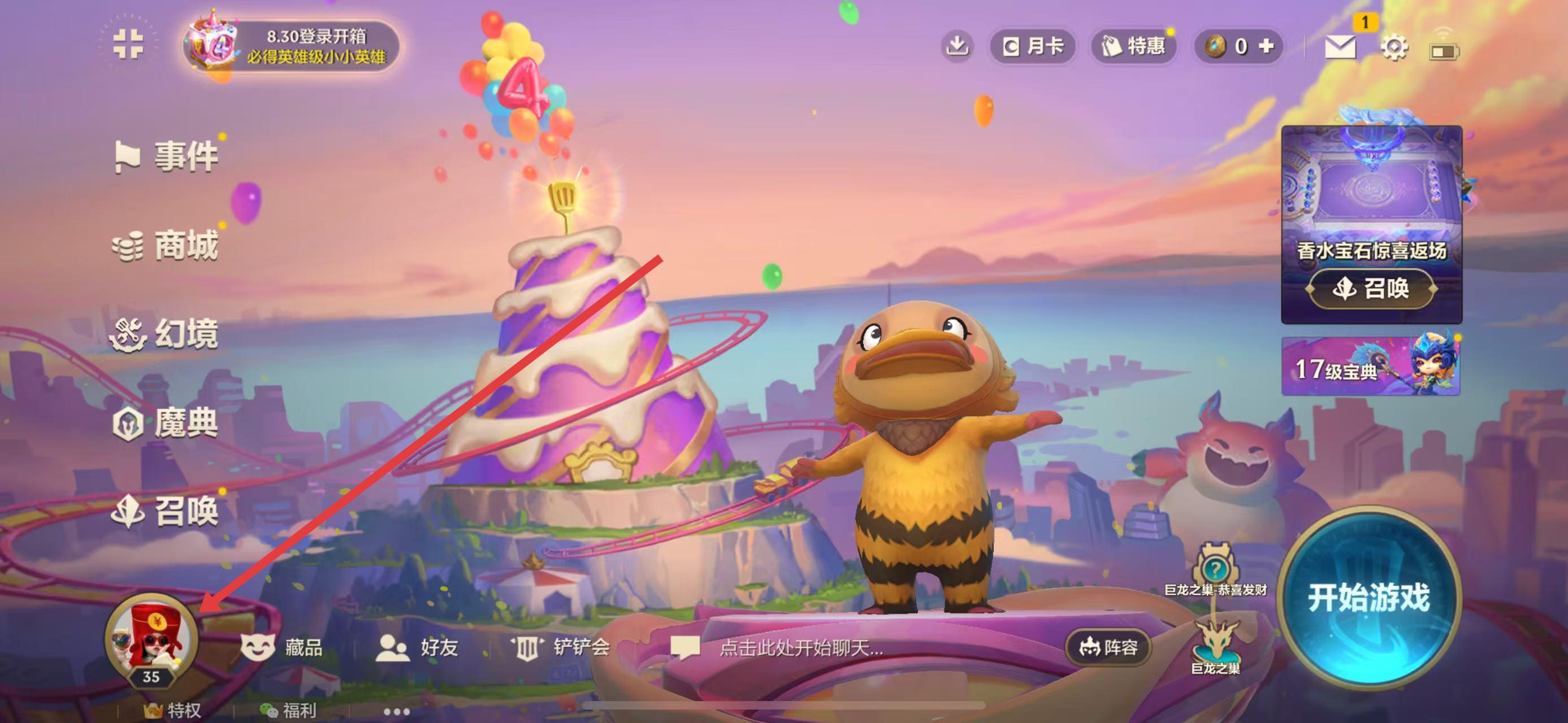 1、打開金鏟鏟之戰(zhàn)游戲,進(jìn)入主界面后,點(diǎn)擊左下角的個(gè)人頭像,進(jìn)入生涯界面。