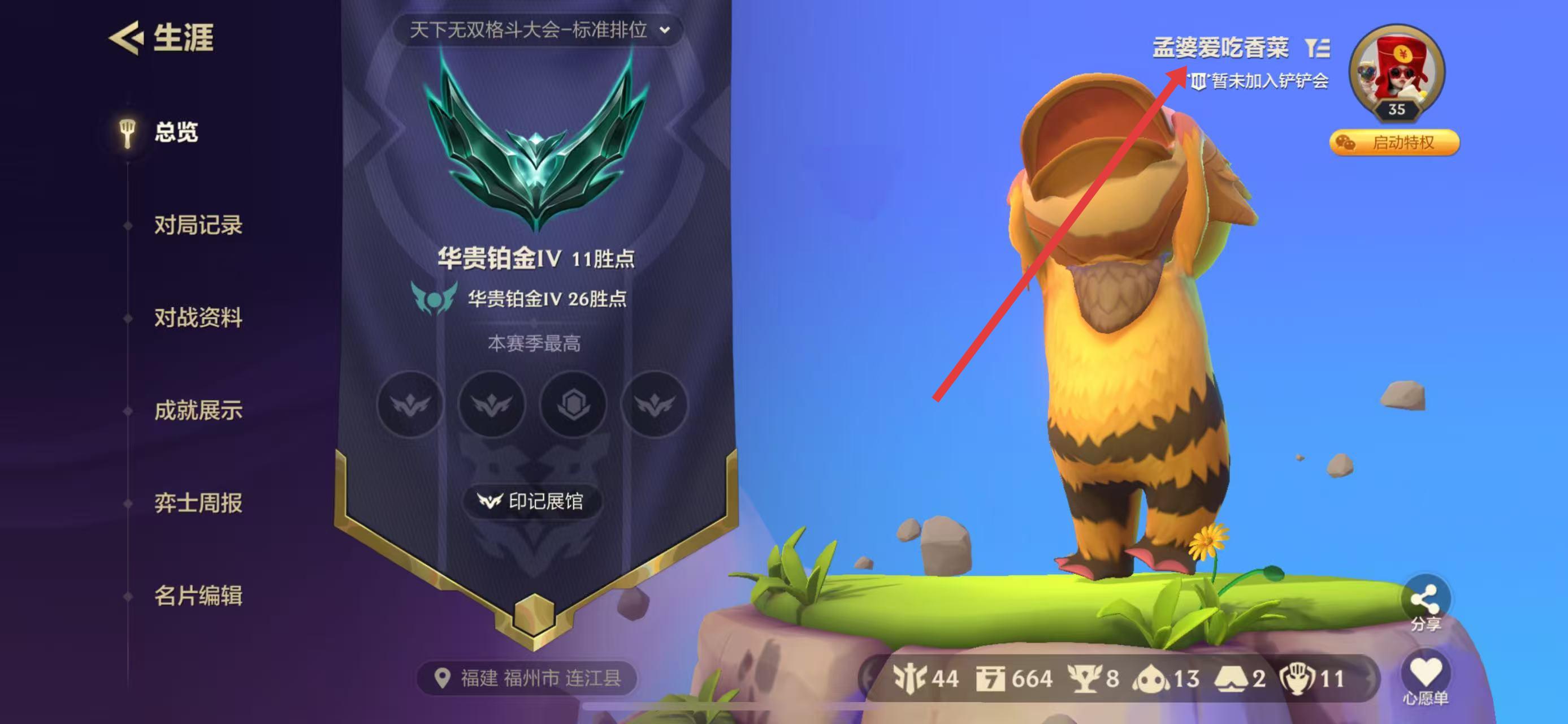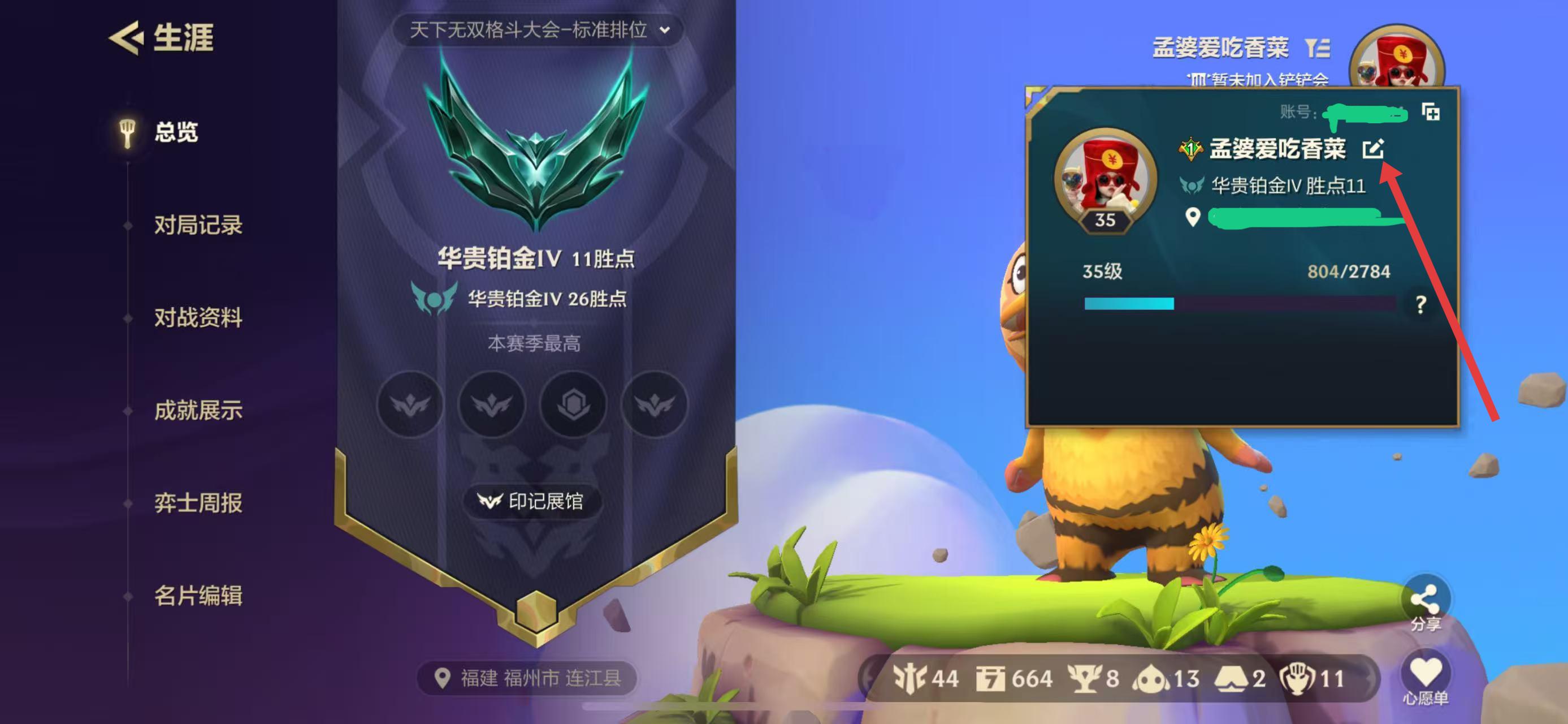 2、在生涯界面中,點(diǎn)擊右上角自己的游戲昵稱位置,會(huì)彈出個(gè)人信息小窗口。