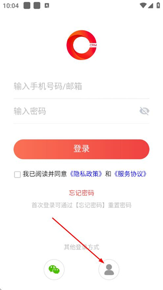 1、打開紅圈CRM+app,在服務(wù)協(xié)議和隱私政策彈窗中點(diǎn)同意。