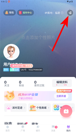 1、打開Uki APP,進(jìn)入我的頁面,點擊右上角三條橫線圖標(biāo),展開側(cè)邊欄。