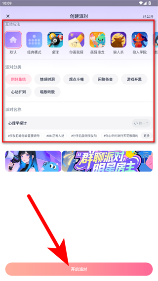 4、在創(chuàng)建派對頁面,選擇互動玩法、派對分類并設(shè)置派對名稱后,點擊開啟派對按鈕,即可完成派對創(chuàng)建。