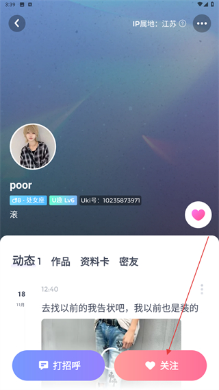 4、進(jìn)入用戶信息的頁面內(nèi),點擊下方關(guān)注的按鈕即可。