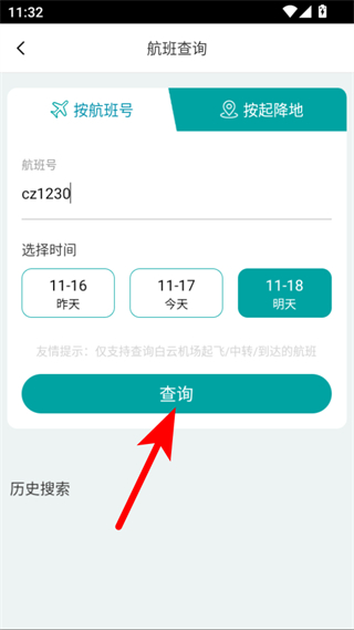 3、選擇航班時間昨天、今天、明天可選,然后點擊查詢按鈕。
