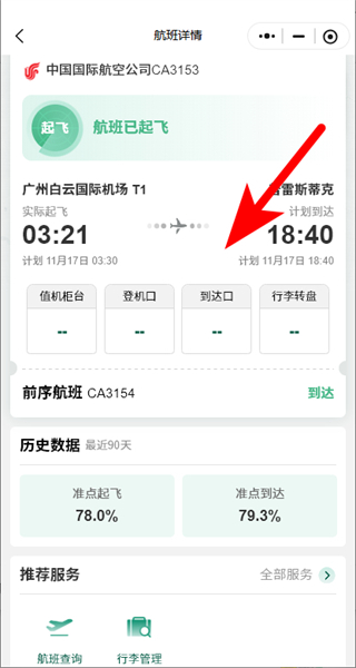 4、即可查看該航班的詳細信息,包括起飛時間、到達時間、值機柜臺、登機口等。