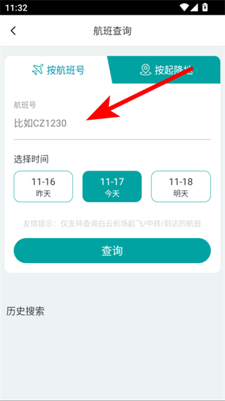 2、進入航班查詢頁面后,選擇按航班號查詢方式,輸入航班號如cz1230。