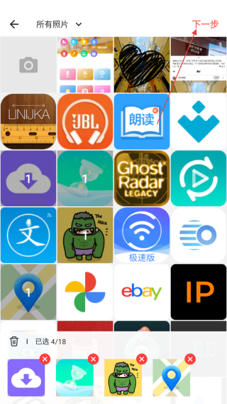 2、進(jìn)入照片選擇界面后,從手機(jī)相冊(cè)中挑選需要參與拼圖的圖片,選好后點(diǎn)擊下一步。