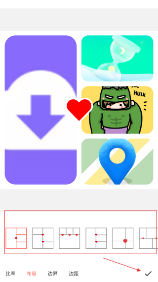 3、在拼圖編輯界面,選擇心儀的拼圖布局,調(diào)整圖片位置、大小等,完成后點(diǎn)擊界面右下角的對(duì)勾確認(rèn)。