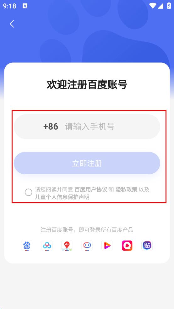 4、在注冊百度賬號頁面,輸入手機號,勾選相關(guān)協(xié)議,點擊“立即注冊”按鈕完成注冊,之后可登錄使用。