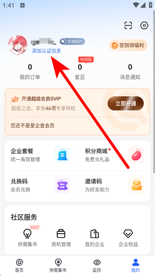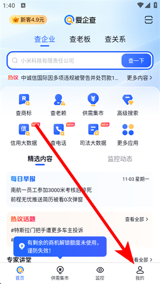 1、打開愛企查APP,進入后在主界面找到右下角“我的”選項并點擊,進入個人頁面。