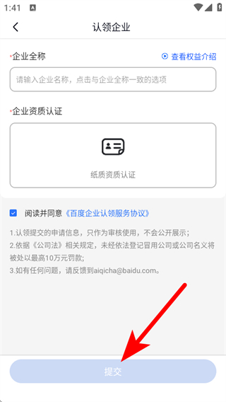 4、進入認領(lǐng)企業(yè)頁面后,輸入信息點擊提交,即可完成企業(yè)認證申請操作。