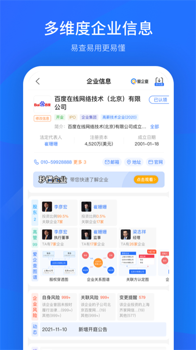 1、企業(yè)信息:工商、變更、股權(quán)結(jié)構(gòu)、主要人員、分支機構(gòu)、企業(yè)圖譜等