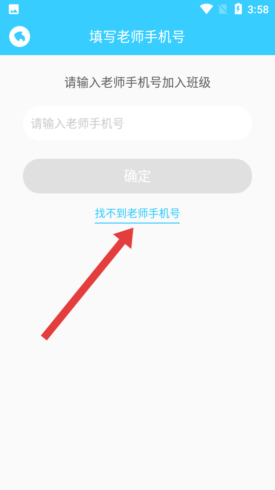 1、如果還沒(méi)有獲取老師的準(zhǔn)確手機(jī)號(hào),可以點(diǎn)擊下方關(guān)于找不到老師手機(jī)號(hào)選項(xiàng),從而進(jìn)入班級(jí)選擇頁(yè)面。