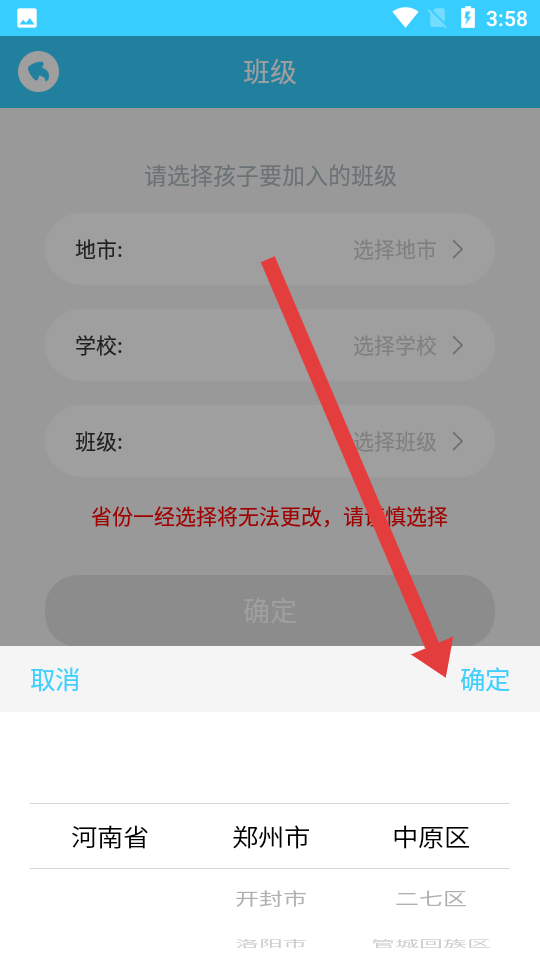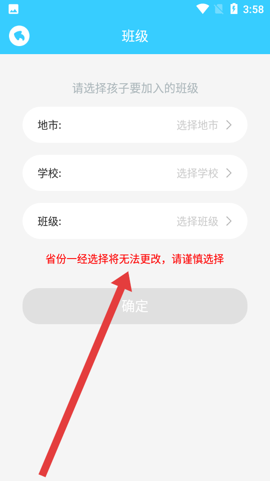2、進(jìn)入班級(jí)選擇頁(yè),按照頁(yè)面順序依次選定地市、學(xué)校和班級(jí),必須要注意的是省份信息確定后不可修改。
