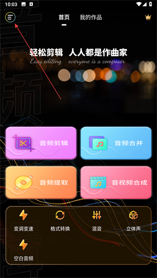 1、打開音頻剪輯提取器應用,點擊界面左上角的菜單按鈕,進入個人功能頁面。