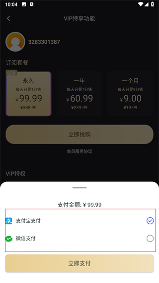4、在支付方式選擇框中,選擇支付寶支付或微信支付,點擊立即支付按鈕,即可成功購買會員。