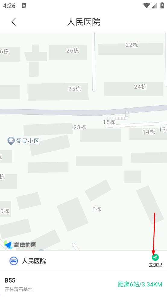 3、在站點(diǎn)詳情頁點(diǎn)擊去這里按鈕,應(yīng)用將規(guī)劃前往該站點(diǎn)的路線,按指引即可前往人民醫(yī)院公交站點(diǎn) 。
