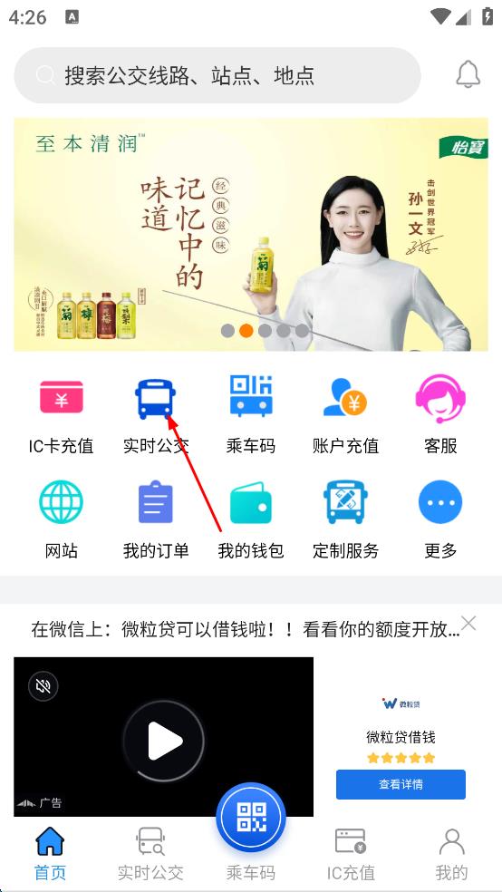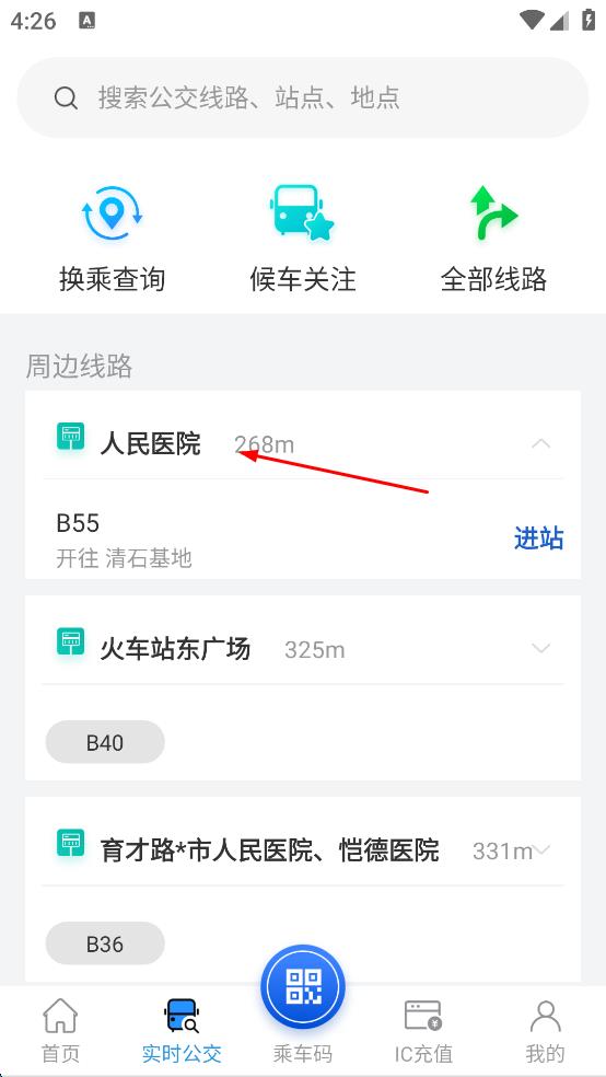 1、打開公交應(yīng)用,在首頁點(diǎn)擊實(shí)時(shí)公交功能,進(jìn)入實(shí)時(shí)公交頁面,可看到換乘查詢、候車關(guān)注等選項(xiàng)及周邊線路。