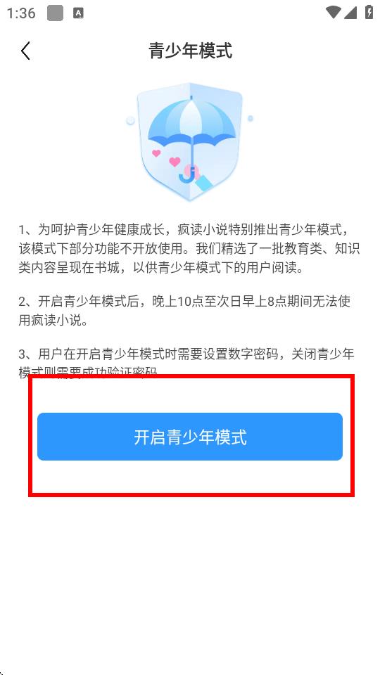4、在青少年模式頁面,點(diǎn)擊開啟青少年模式按鈕,按提示設(shè)置數(shù)字密碼后,即可成功開啟。