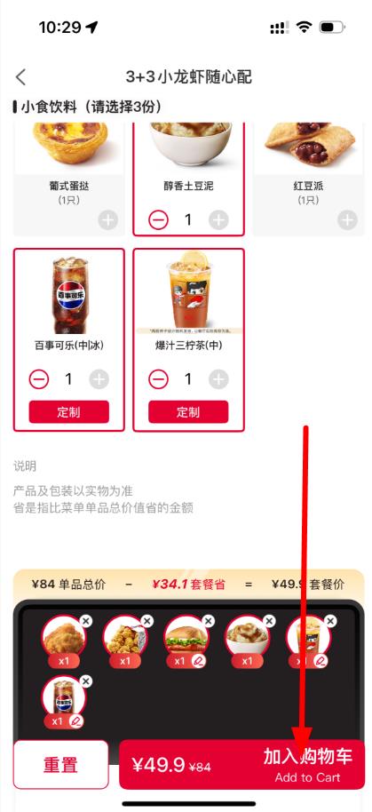 3、在餐品規(guī)格選擇頁面,按需選擇小食、飲料等具體品類和數(shù)量,確認(rèn)后點(diǎn)擊加入購物車,完成所有想點(diǎn)的餐品選擇后,進(jìn)入購物車結(jié)算并填寫送餐地址等信息。
