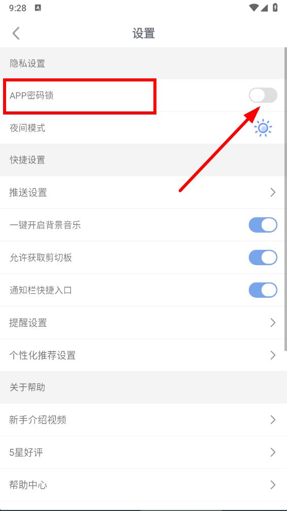 3、在設(shè)置頁(yè)面里,找到APP密碼鎖選項(xiàng),點(diǎn)擊其右側(cè)的開關(guān)按鈕將其開啟,準(zhǔn)備進(jìn)行密碼設(shè)置操作。