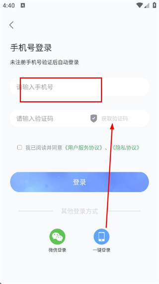 3、在手機(jī)號(hào)登錄頁(yè)面,輸入手機(jī)號(hào),點(diǎn)擊獲取驗(yàn)證碼。