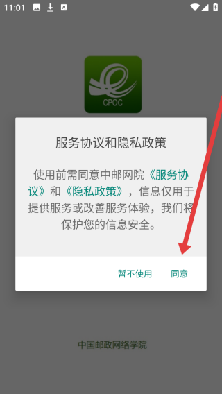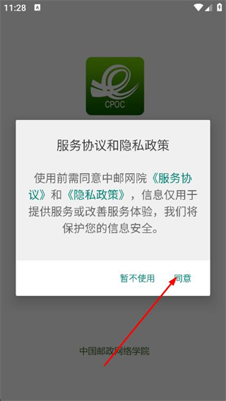 1、打開中郵網(wǎng)院app,在彈出的隱私政策提示框中,點擊同意按鈕。