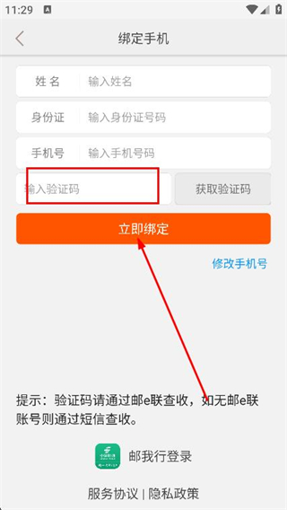 3、填入收到的驗證碼,點擊立即綁定按鈕,完成手機(jī)綁定后即可登錄。