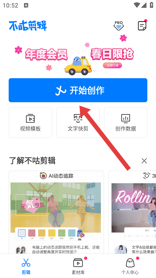 1、打開不咕剪輯APP,點擊開始創(chuàng)作,進入素材選擇的界面。