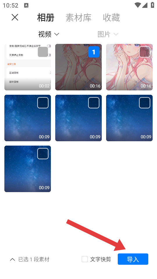 2、在素材選擇界面選取目標視頻素材,點擊導入,進入視頻編輯界面。