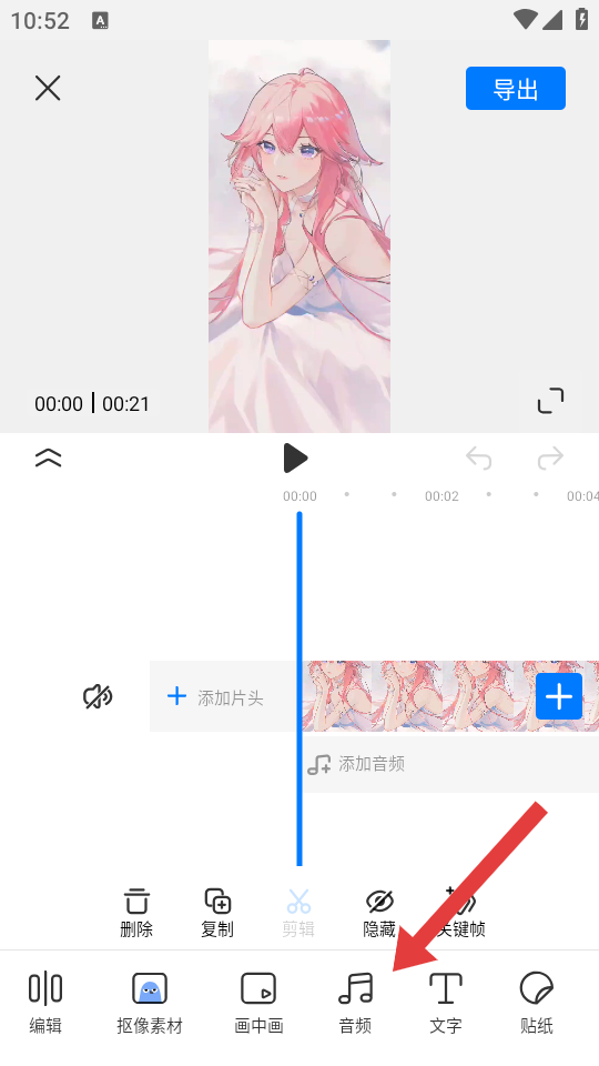3、在視頻編輯的界面,需要點擊音頻的功能,展開音頻操作欄。
