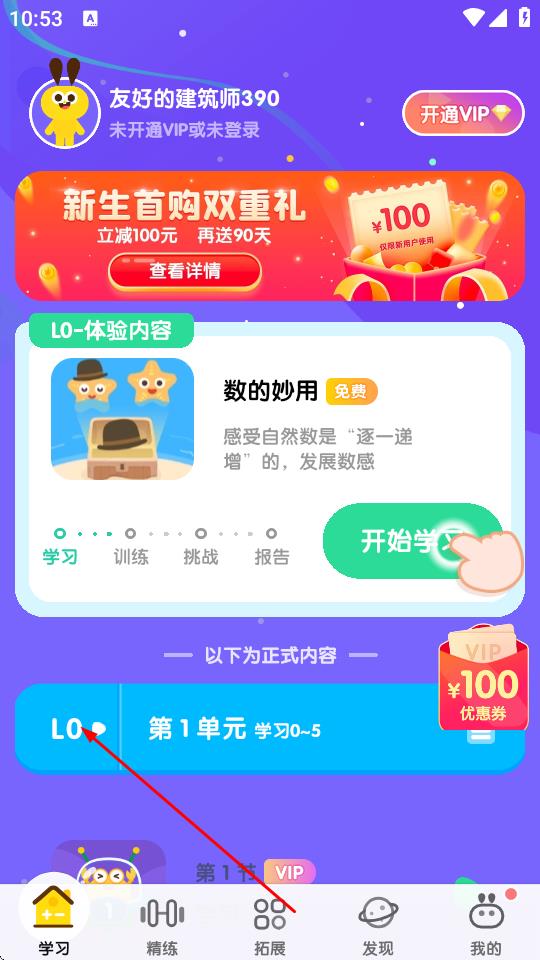2、進入APP主界面,點擊下方導(dǎo)航欄中的學(xué)習(xí),再點擊頁面中的L0標(biāo)識。