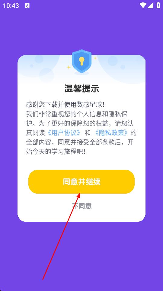 1、打開數(shù)感星球APP,在彈出的溫馨提示頁面,點擊同意并繼續(xù)。
