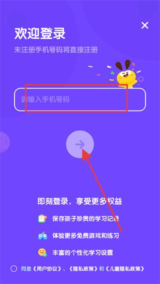 3、在歡迎登錄頁面,輸入手機號,點擊箭頭按鈕。