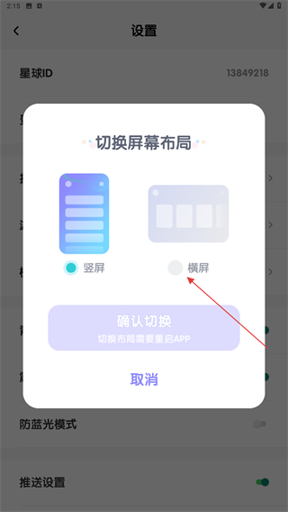 4、當(dāng)彈出切換屏幕布局的頁面內(nèi),點擊橫屏的按鈕即可。