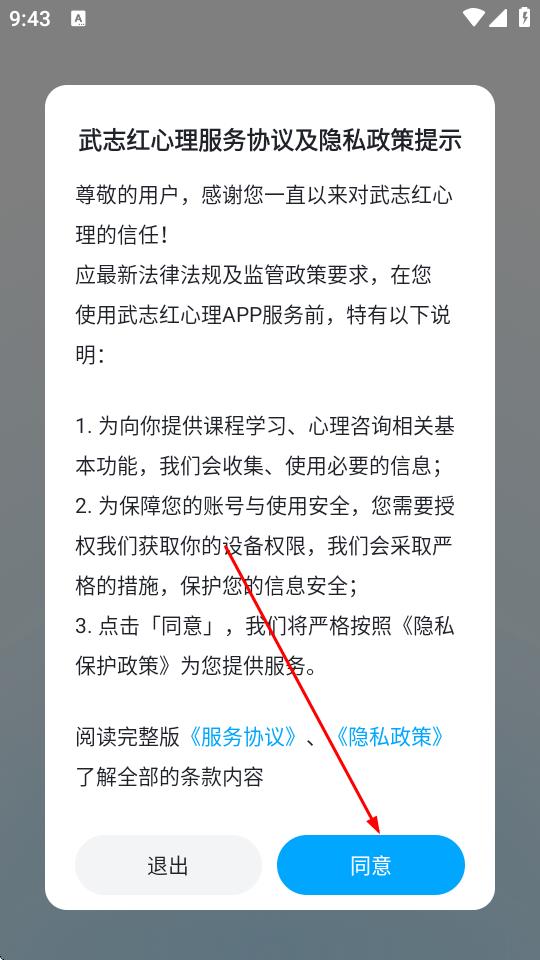 1、打開武志紅心理APP,在彈出的武志紅心理服務(wù)協(xié)議及隱私政策提示頁面,點擊同意。