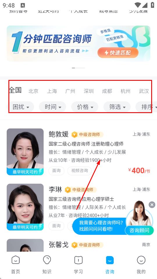 3、在咨詢頁面,可以通過地區(qū)、困擾類型、時間、價格等條件篩選心理咨詢師,找到合適的咨詢師。