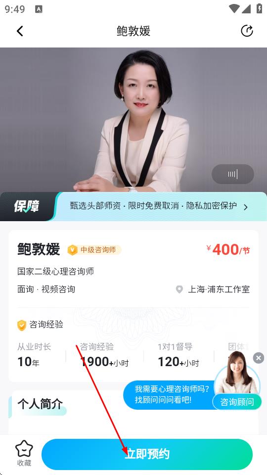 4、點擊選中的咨詢師,進(jìn)入咨詢師詳情頁面,查看其資質(zhì)、擅長領(lǐng)域、咨詢經(jīng)驗等信息,點擊立即預(yù)約,完成預(yù)約流程。