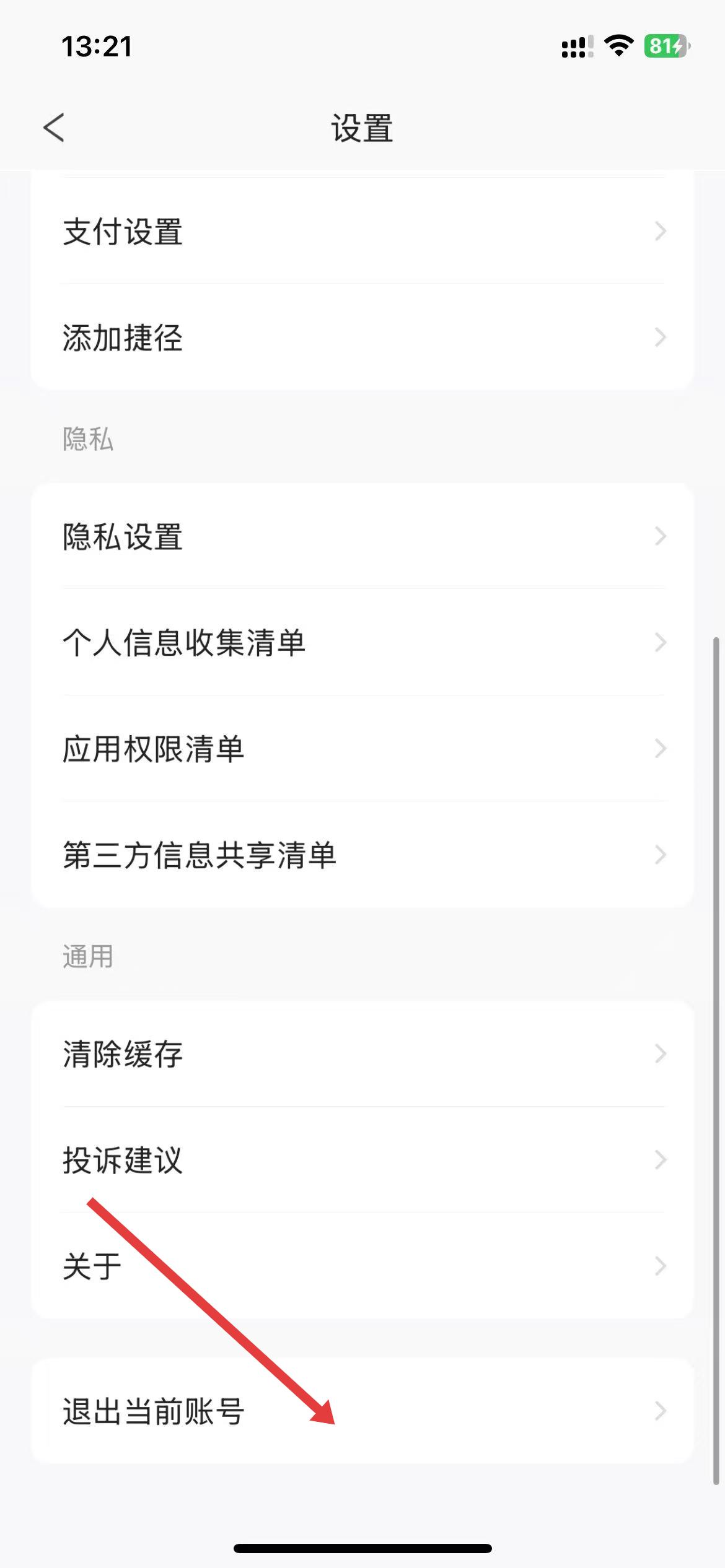 2、在設(shè)置界面中,下滑找到退出當(dāng)前賬號(hào)。
