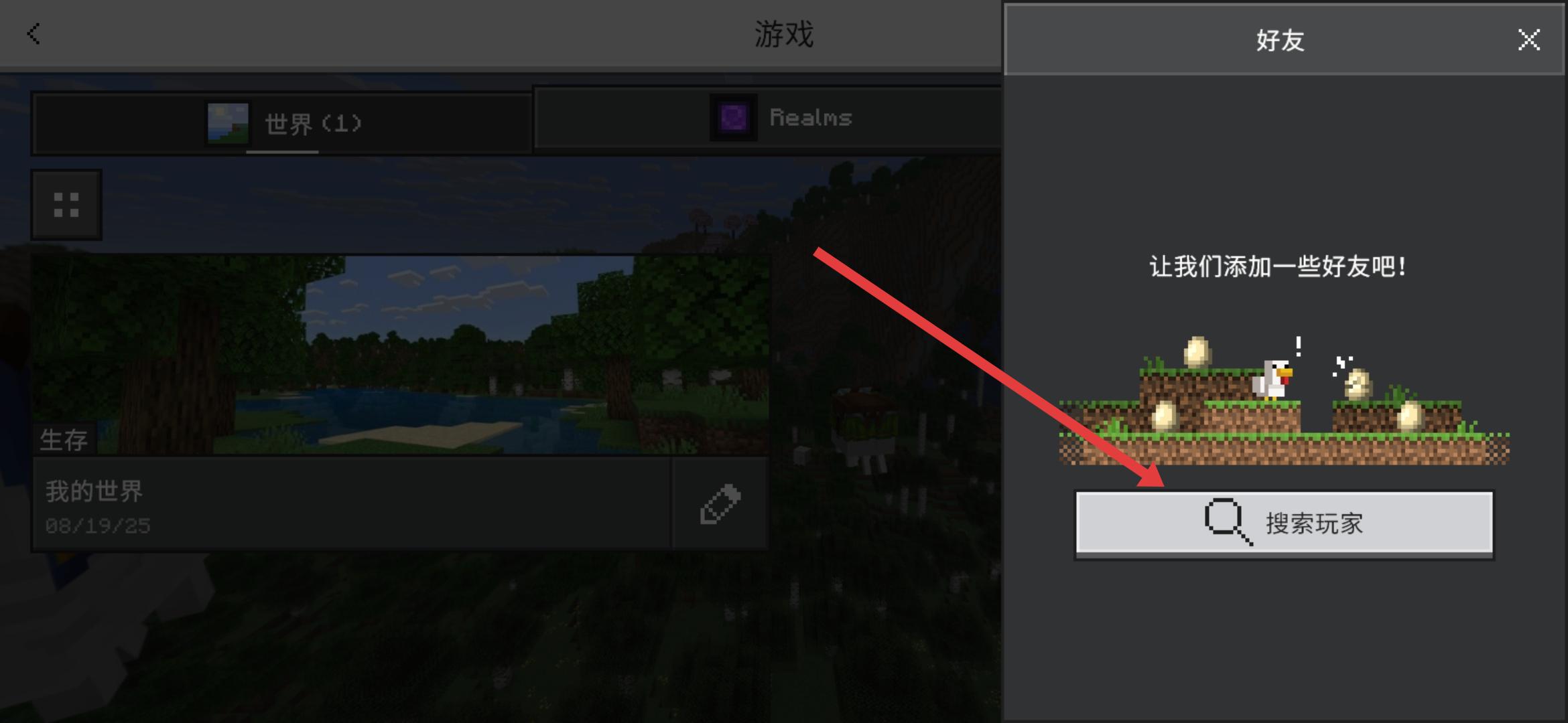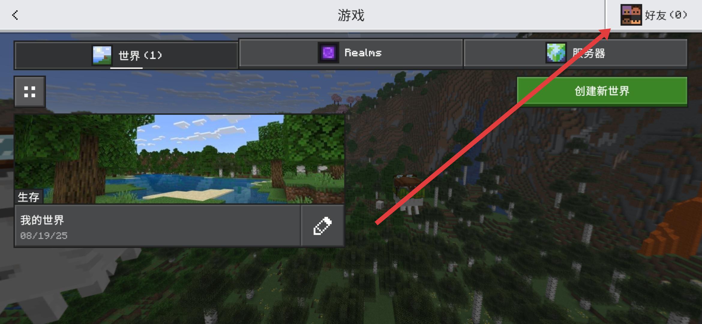 1、進(jìn)入我的世界創(chuàng)建游戲主界面,點擊右上角好友0圖標(biāo),進(jìn)入好友管理界面,開啟添加好友流程。