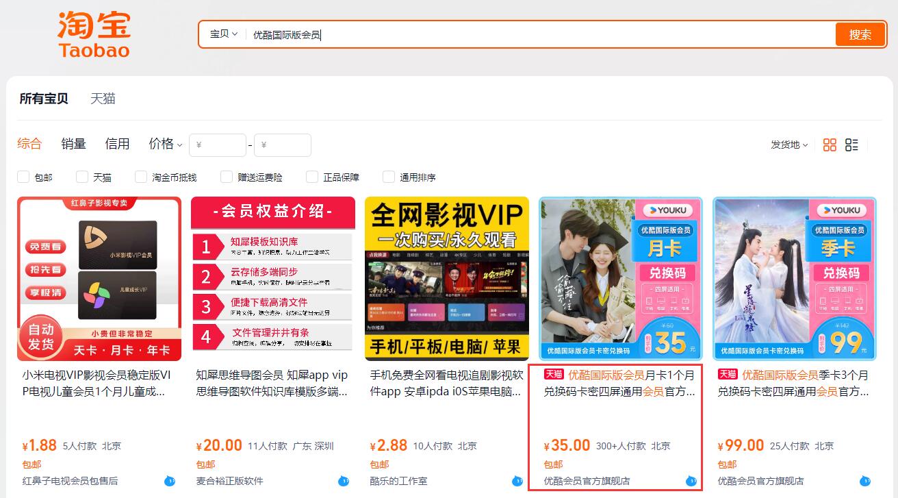 1、首先打開某寶,搜索“優(yōu)酷國(guó)際版會(huì)員”,在結(jié)果中選擇優(yōu)酷會(huì)員官方旗艦店的商品鏈接;