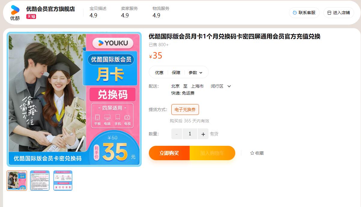 2、在商品詳情頁(yè)購(gòu)買優(yōu)酷國(guó)際版會(huì)員,分為1個(gè)月、3個(gè)月等不同的兌換券可以使用;