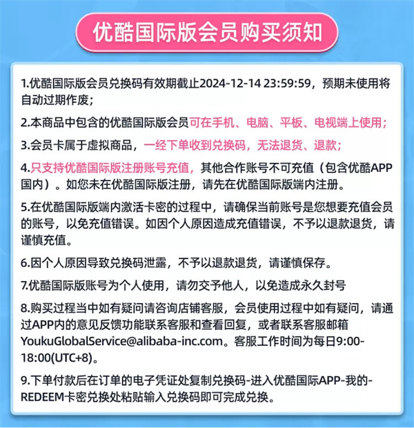 3、優(yōu)酷國(guó)際版會(huì)員可以在手機(jī)、電腦、平板、電視端使用,具體使用方式參考優(yōu)酷國(guó)際版會(huì)員購(gòu)買須知。